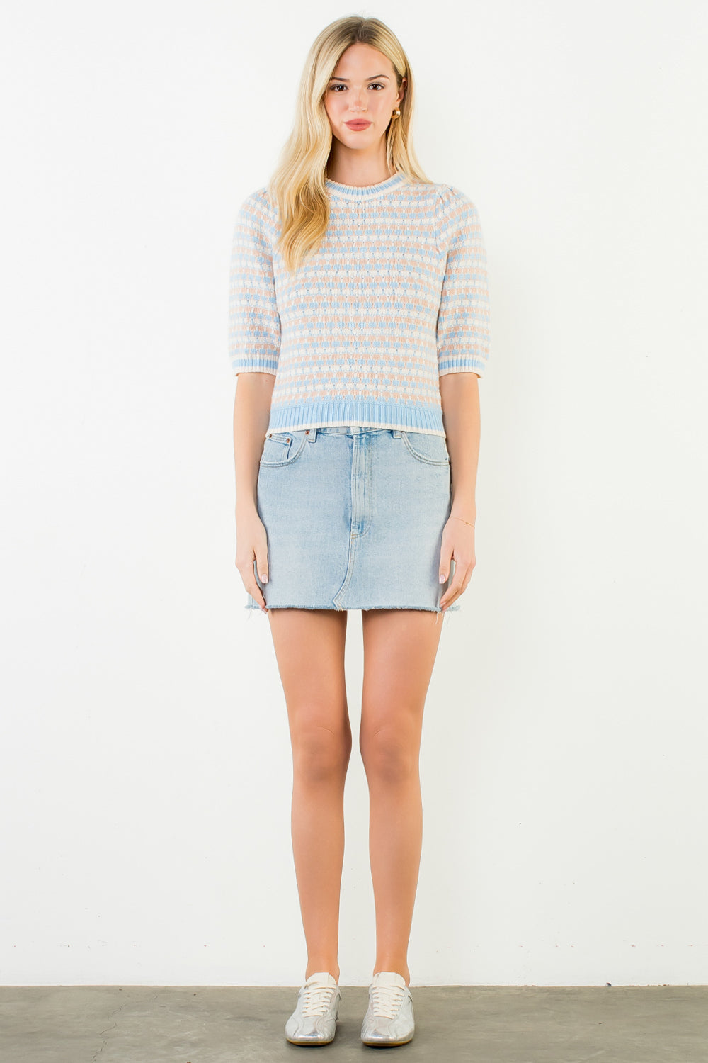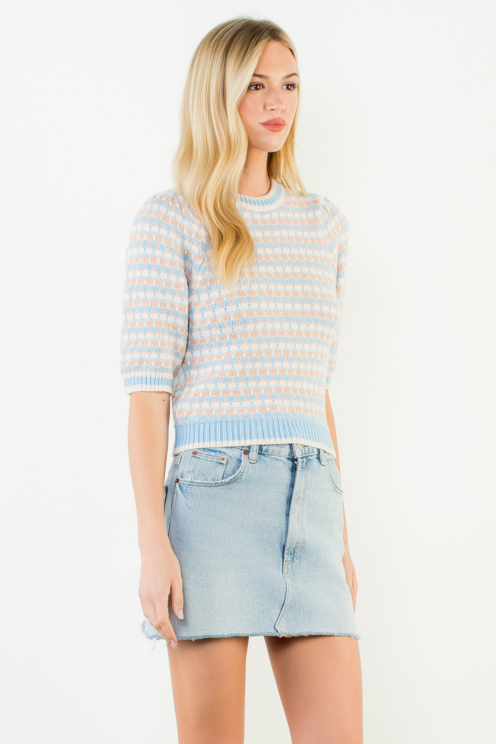 Esme Shortsleeve Knit Sweater - Mushroom, Sky Blue & Pink Beige
